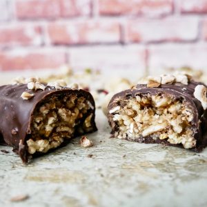 Baton musli oblany mleczną czekoladą posypany orzechami