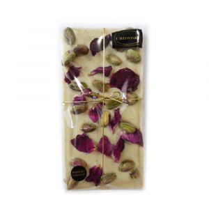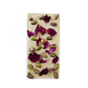 Skład: tłuszcz kakaowy, mleko w proszku, cukier puder, pistacje, płatki róż.