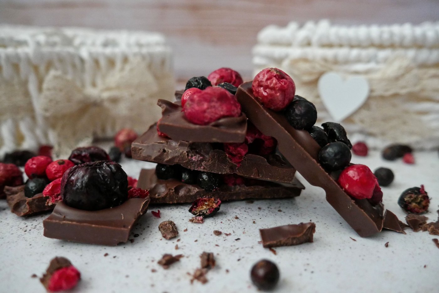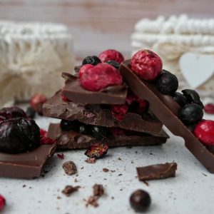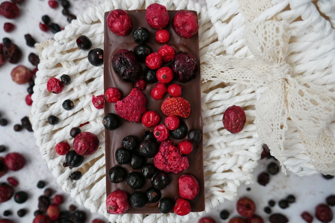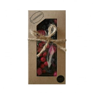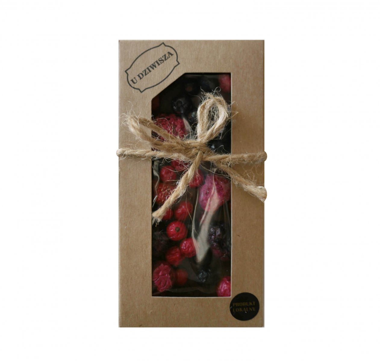 Skład: kakao chuncho 50%, mleko w proszku, cukier trzcinowy, masło kakaowe,owoce liofilizowane.