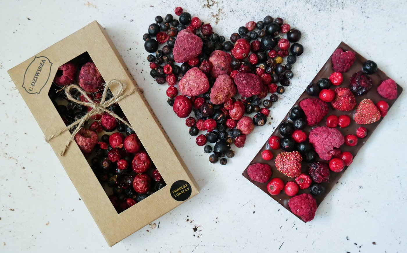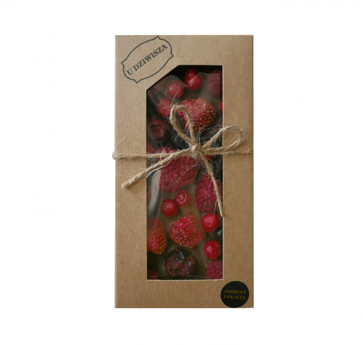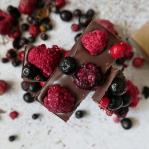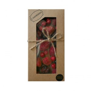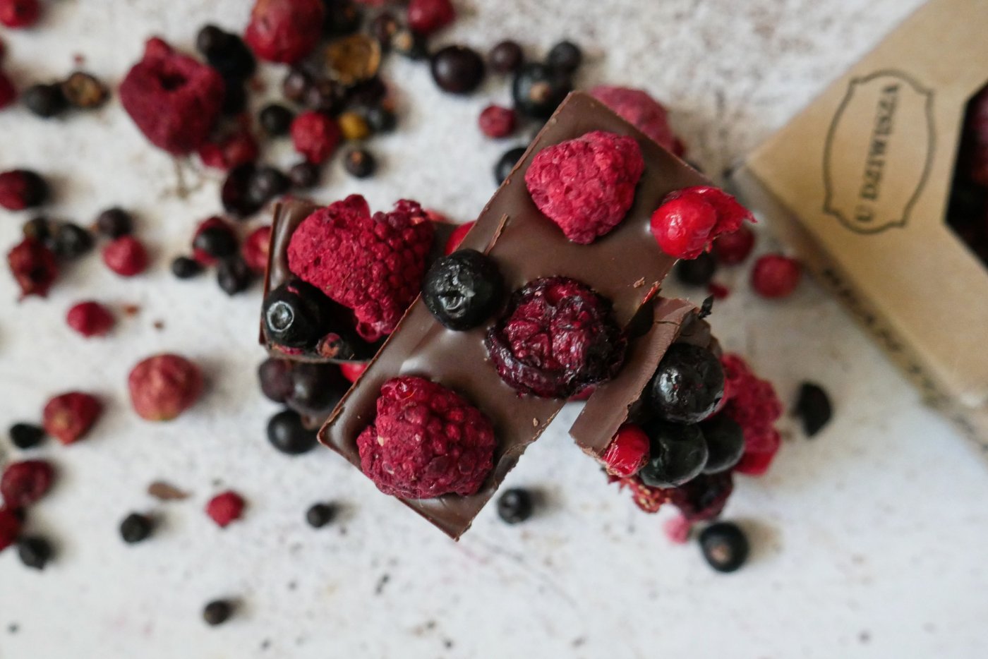 Skład: masło kakaowe, miazga kakaowa chuncho 80%, mleko w proszku, cukier trzcinowy, słód jęczmienny, owoce liofilizowane.